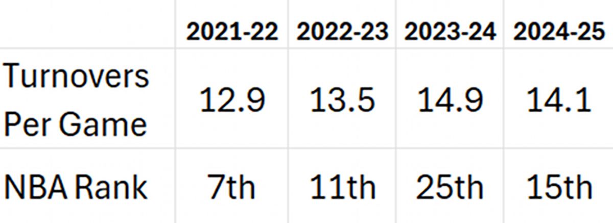 Or turnovers. 2021-22: 12.9 turnovers per game, seventh in the NBA. 2024-25: 14.1 turnovers per game, 15th in the NBA.
