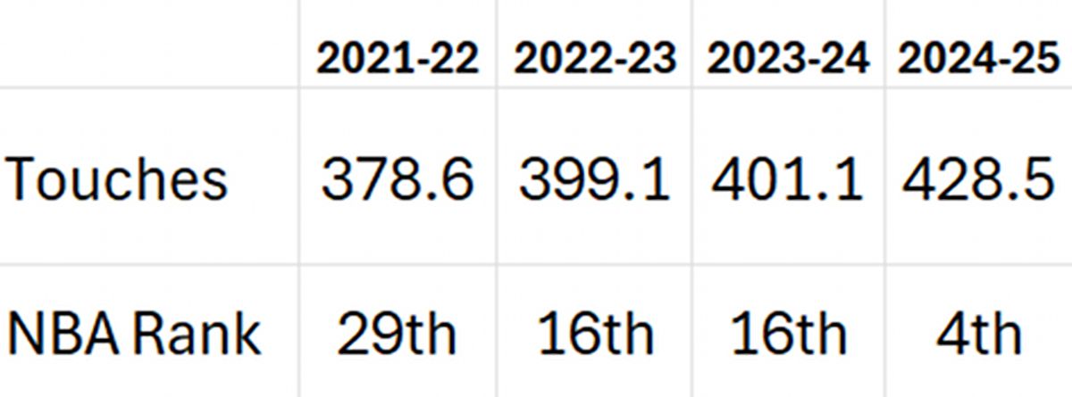 Or touches. In 2021-22, the Suns averaged 378.6 touches per game (second-fewest). By 2024-25, they were averaging 428.5 (fourth most).