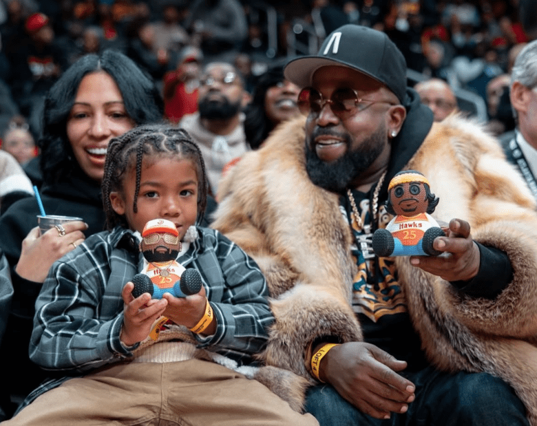 Big Boi and his family show off the Outkast vinyl figures at the Atlanta Hawks game on Dec. 2. (Photo courtesy Atlanta Hawks)