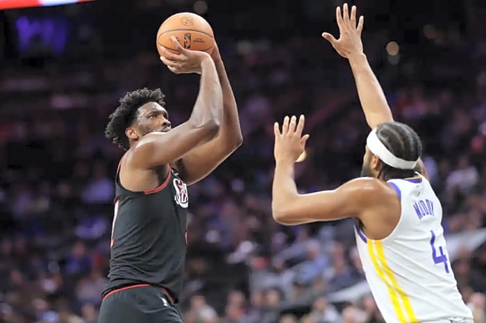 Dec 4, 2025; Philadelphia, Pennsylvania, USA; Philadelphia 76ers center Joel Embiid (21) shoots past Golden State Warriors guard Moses Moody (4) during the first quarter at Xfinity Mobile Arena. Mandatory Credit: Bill Streicher-Imagn Images