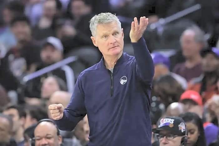 Dec 4, 2025; Philadelphia, Pennsylvania, USA; Golden State Warriors head coach Steve Kerr reacts during the third quarter against the Philadelphia 76ers at Xfinity Mobile Arena. Mandatory Credit: Bill Streicher-Imagn Images