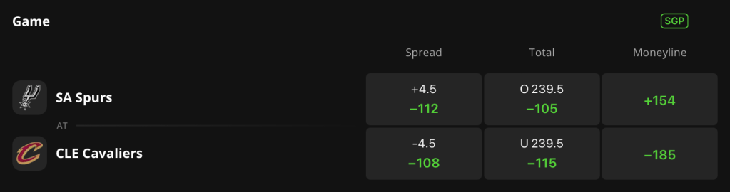 Looking at the odds for tonight, the Cavaliers enter as 4.5-point favorites and hold -185 odds on the Moneyline on DraftKings Sportsbook. The Spurs hold +154 odds of winning outright with the game total set at 239.5 points.