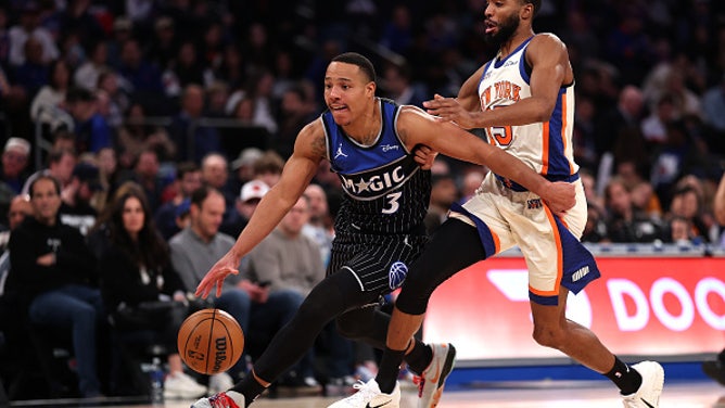 NEW YORK, NEW YORK – DECEMBER 07: Desmond Bane #3 of the Orlando Magic drives while being defended by Mikal Bridges #25 of the New York Knicks during the third quarter at Madison Square Garden on December 07, 2025 in New York City. (Photo by Ishika Samant/Getty Images)