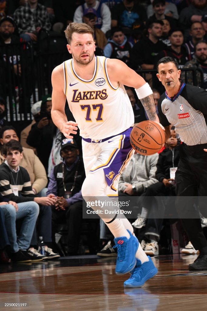Luka Doncic #77 of the Los Angeles Lakers dribbles the ball during the game against the Philadelphia 76ers (Photo by David Dow/NBAE via Getty Images)
