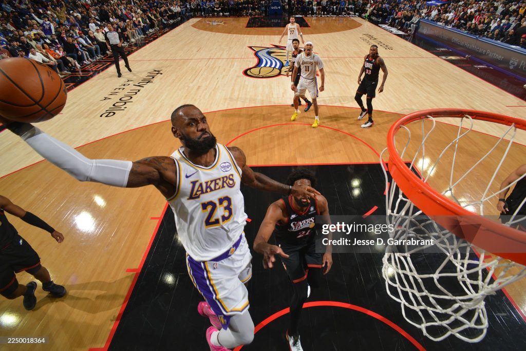 LeBron James #23 of the Los Angeles Lakers dunks the ball during the game against the Philadelphia 76ers (Photo by Jesse D. Garrabrant /NBAE via Getty Images)