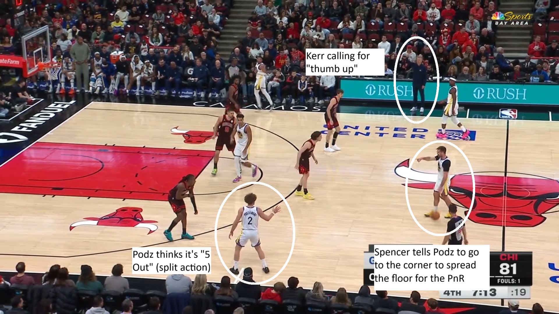 When Kerr once again calls for “thumb up” in the possession below while Podziemski mistakenly thinks the possession to be “5 Out” (the team’s term for a low-post split action), Spencer takes control and clarifies the situation by telling Podziemski where he should be:
