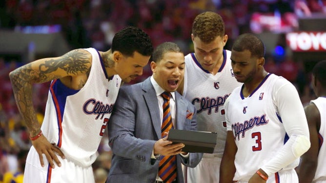 Basketball: NBA Playoffs: Los Angeles Clippers (L-R) Matt Barnes, assistant coach Tyronn Lue, Blake Griffin, and Chris Paul during game vs Golden State Warriors at Staples Center. Game 7. Los Angeles, CA 5/3/2014 Photo: John W. McDonough (Photo by John W. McDonough /Sports Illustrated via Getty Images)