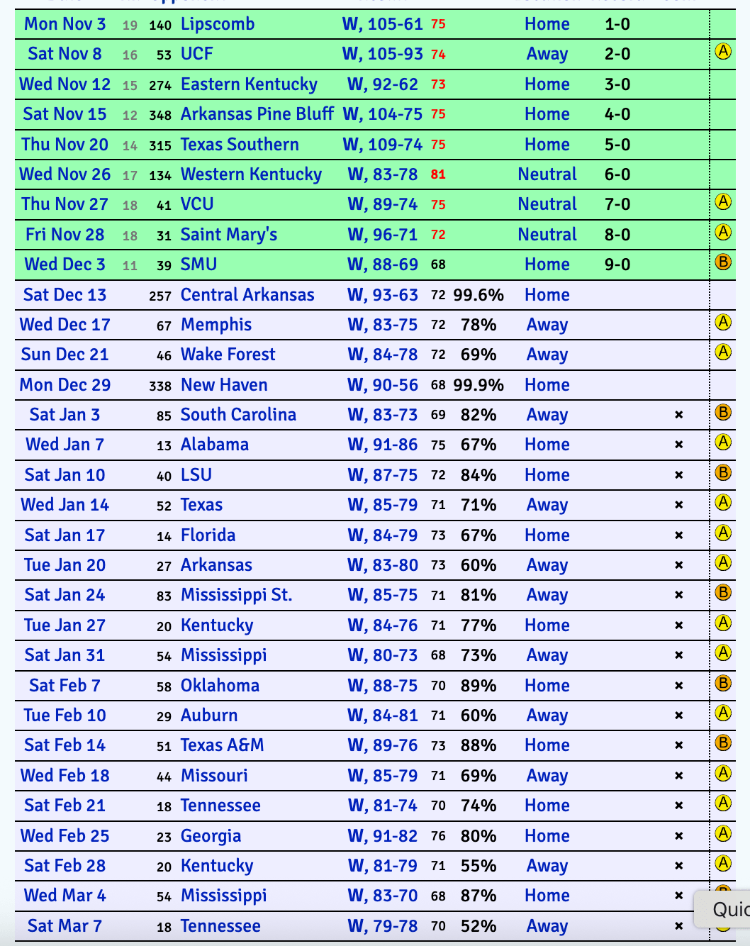 Is there a bigger surprise team in college basketball this season than Vanderbilt? The Commodores’ 9-0 start includes wins over St. Mary’s, SMU, and VCU, and they’re starting to get hyped as a team that can potentially make a deep run in the NCAA tournament. KenPom even has Vandy running the table right now as the projected winner in every game the rest of the way: