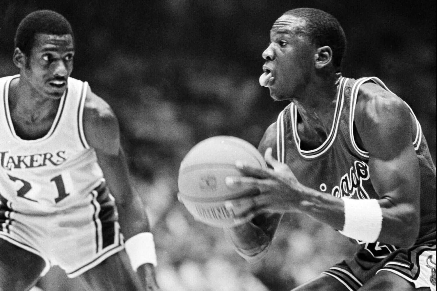 Michael Jordan, right, prepares to go up with the ball as Los Angeles Lakers guard Michael Cooper looks on during a game at the Forum on Dec. 2, 1984. (Reed Saxon / Associated Press)