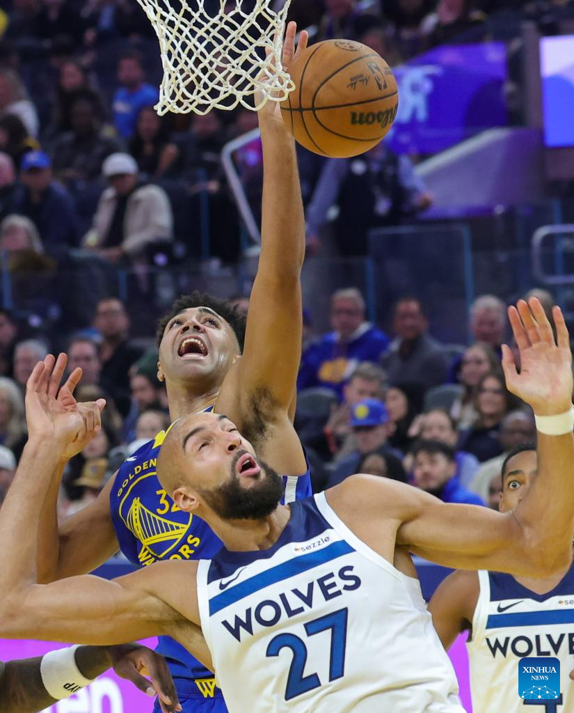 Moses Moody (L) of Golden State Warriors vies the ball during the 2025-2026 NBA regular season match between Golden State Warriors and Minnesota Timberwolves in San Francisco, the United States, on Dec. 12, 2025. (Photo by Dong Xudong/Xinhua)