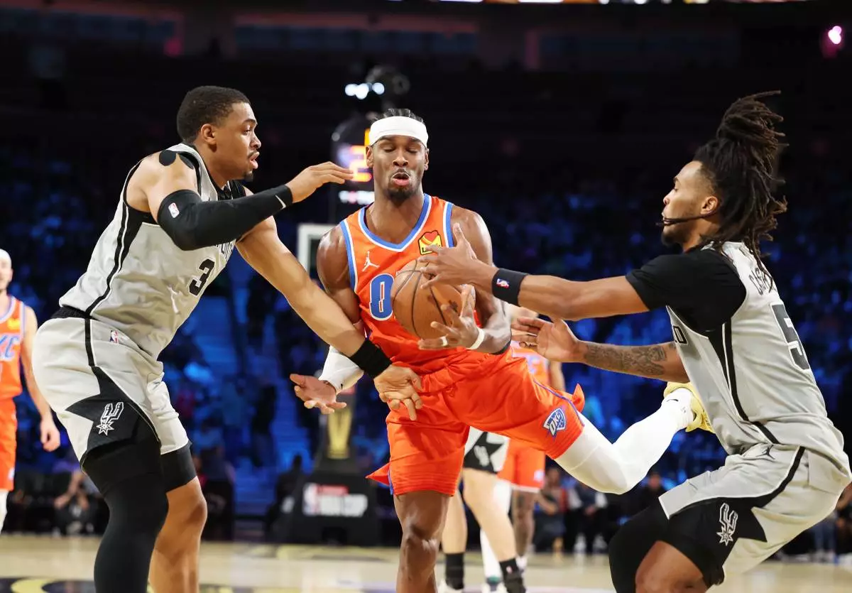Oklahoma City Thunder guard Shai Gilgeous-Alexander, center, tangles with San Antonio Spurs’ Keldon Johnson (3) and Stephon Castle (5) under the net in the first half of an NBA Cup semifinals basketball game, Saturday, Dec. 13, 2025, in Las Vegas. (AP Photo/Ronda Churchill)