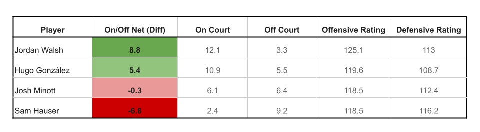 Of all the non-Jaylen Brown wings, Hauser maintains a narrow lead in minutes per game. In terms of on court impact, he’s lagging behind.
