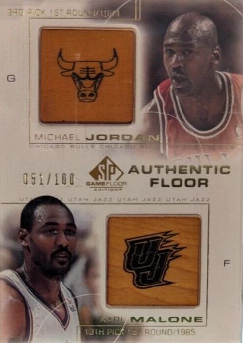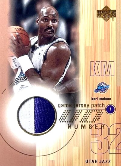 Upper Deck releases dominate the top 10 Malone cards from 2000-01 sets in terms of secondary market values. A commonality, of the 10, seven are serial numbered cards. One of the more interesting is 2000-01 SP Game Floor Authentic Floor Combos #C17 Michael Jordan/Karl Malone /100. The 30-card set took pieces of NBA hardwood paired with the players who dominate on the court. If true to the intention, as much as it is an individual artifact for two Hall of Famers, for fans of the Bulls and Jazz, it is a roster memorabilia piece as well.