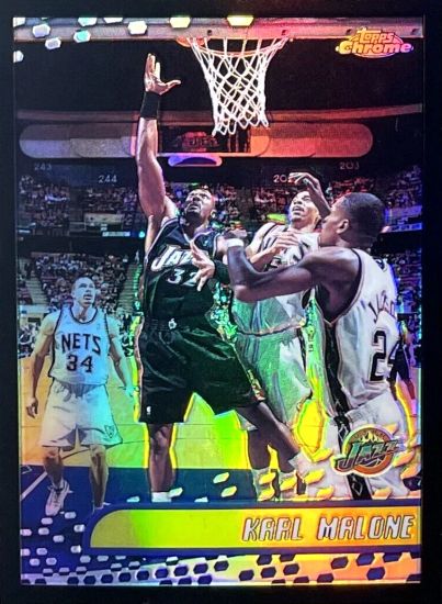 The pictured 2002-03 Finest Refractors #41 Karl Malone /250 starts around $15 but expect higher price tags on platforms like eBay.