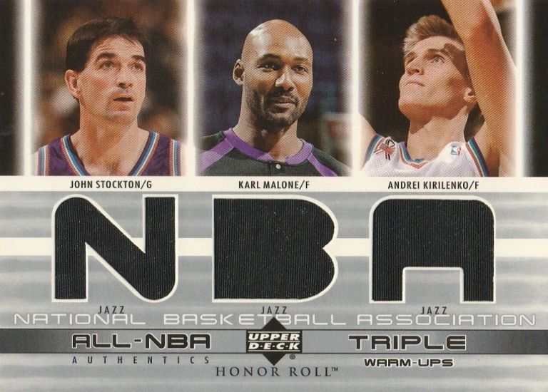 Similar to the SP Game Used Authentic Fabrics Triple #5 but far less expensive ($15-20 mint) is the 2002-03 Upper Deck Honor Roll Triple Warm-Ups #5 John Stockton/Karl Malone/Andrei Kirilenko.