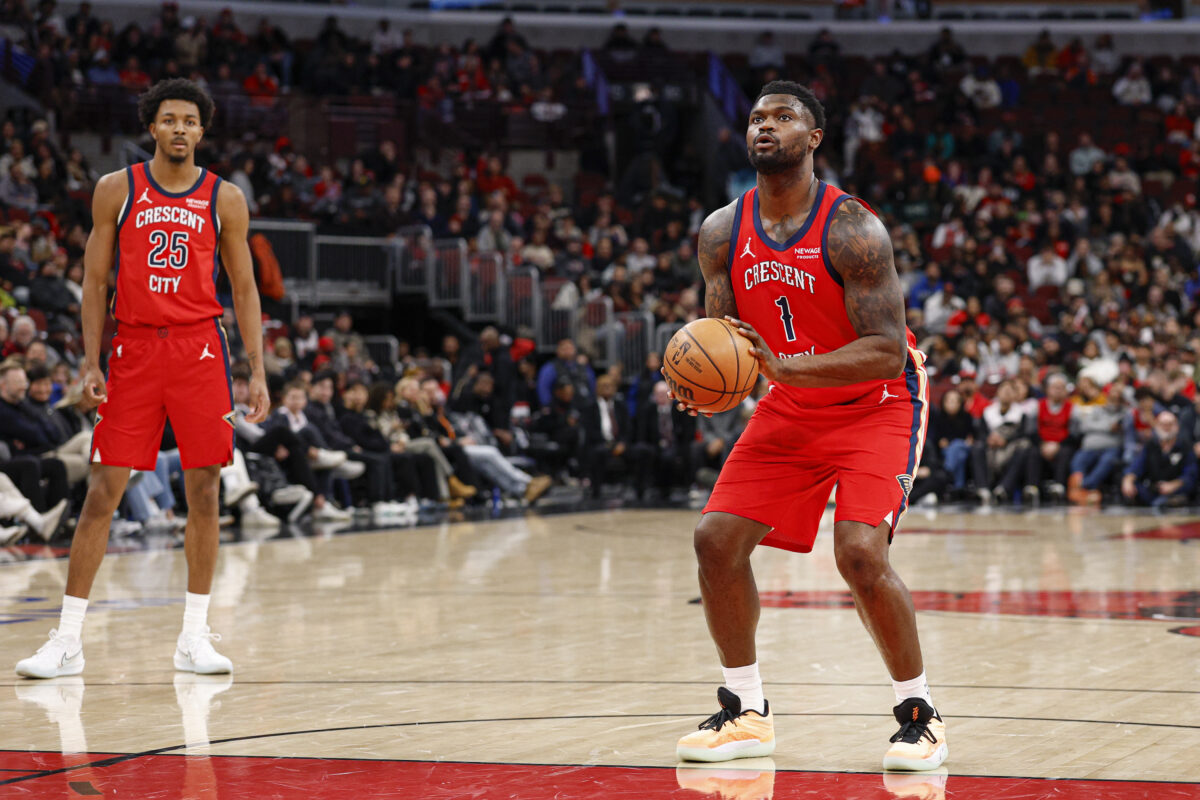 Dec 14, 2025; Chicago, Illinois, USA; New Orleans Pelicans forward Zion Williamson (1) shoots a free throw against the Chicago Bulls during the second half at United Center. Mandatory Credit: Kamil Krzaczynski-Imagn Images