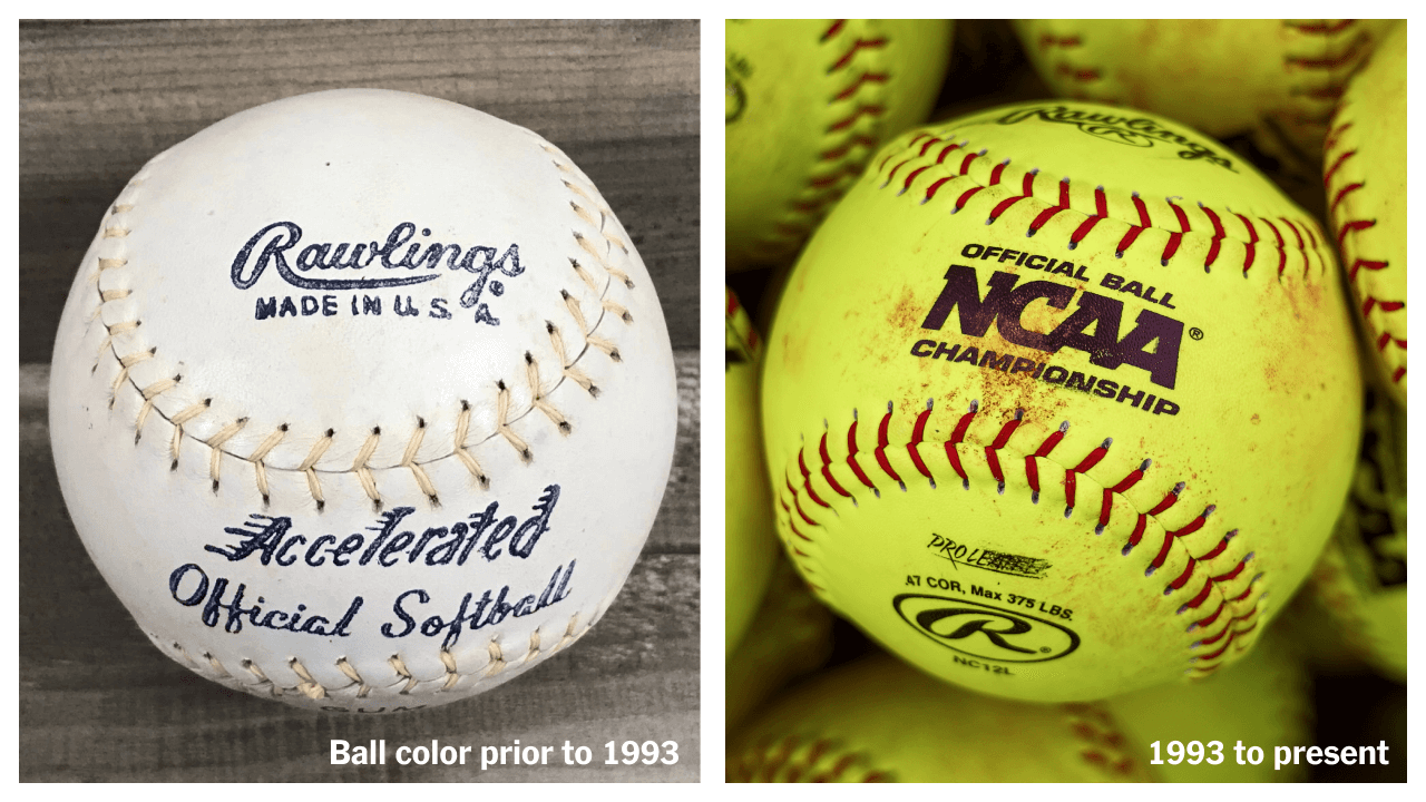 But it wasn’t enough, so before the 1993 season, the rules committee decided to switch to an optic yellow ball — at the time, research said the human eye could pick up optic yellow faster than any other color — with raised red seams, which would allow hitters to better identify the spin coming at them. (Though college softballs are thrown in a range of 64-70 mph compared to baseball’s 87-95 mph range, the movement on a rise ball typically makes it more challenging to hit.)