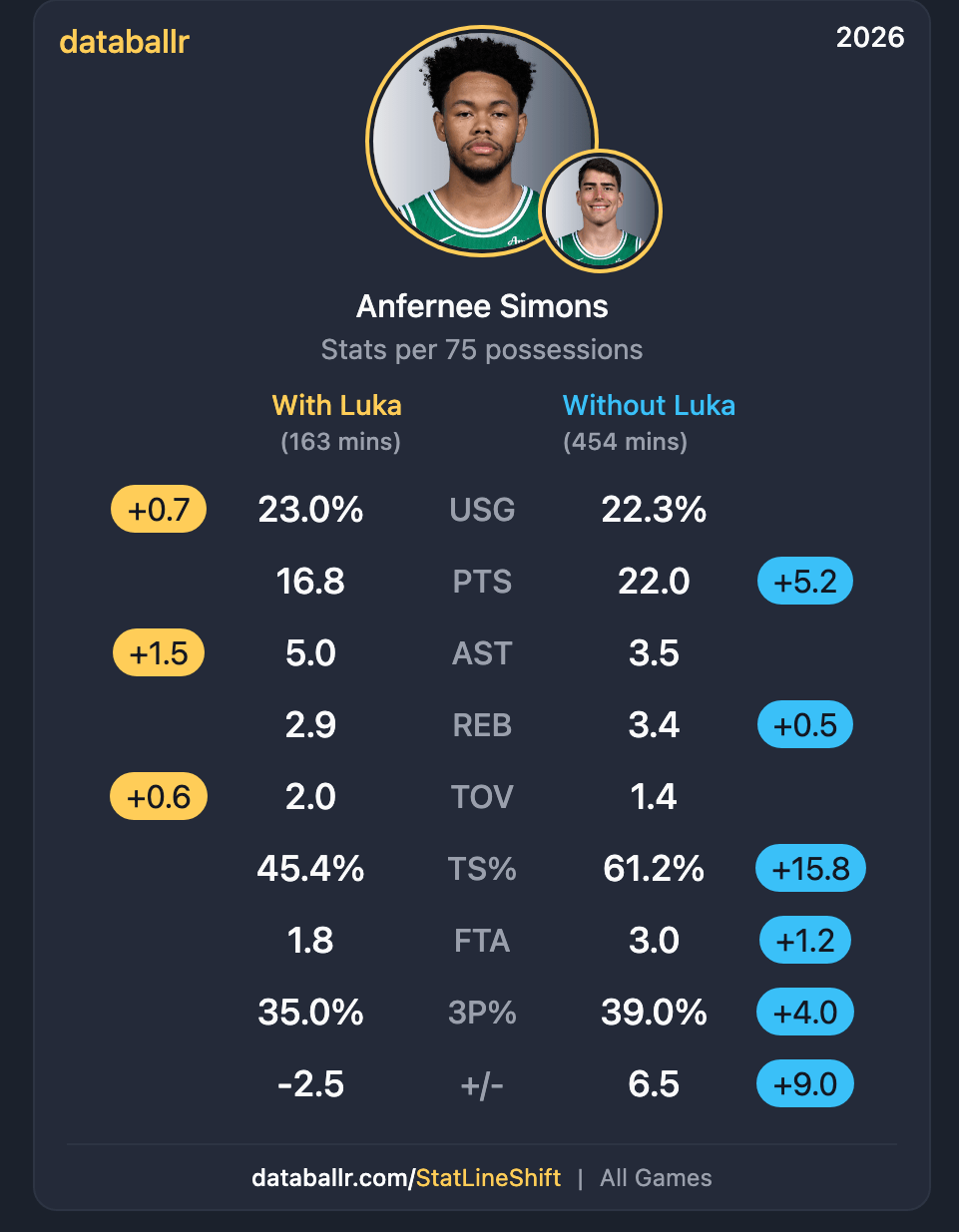 When filtering out low-leverage minutes, that shows up clearly. The Celtics are essentially neutral with Simons on the floor (+0.4 Net Rating), compared to a +6.9 mark when he’s off. For a player brought in to juice the bench offense, the swing is hard to ignore.