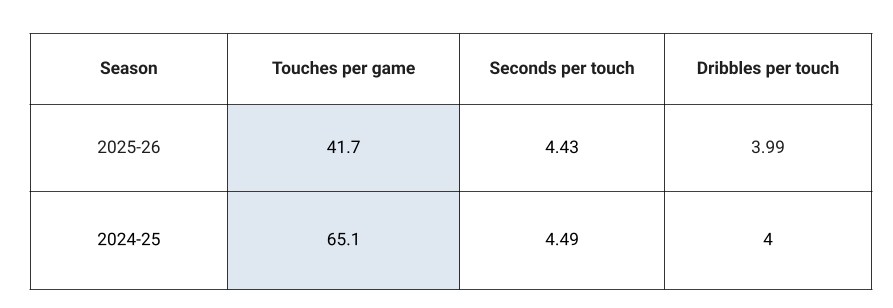 In Boston, he isn’t afforded the same green light he’s grown accustomed to, and that adjustment has proven tricky. His touches have dropped sharply — from 65.1 per game in Portland to 41.7 — but the way he uses them hasn’t changed much. He still ranks first on the team in seconds per touch, and second in average dribbles per touch.