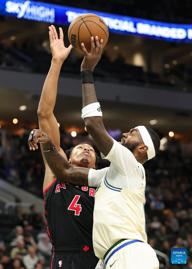 Milwaukee Bucks’ Kevin Porter Jr. (top L) competes during the 2025-2026 NBA regular season game between Milwaukee Bucks and Toronto Raptors in Milwaukee, the United States, on Dec. 18, 2025. (Photo by Joel Lerner/Xinhua)
