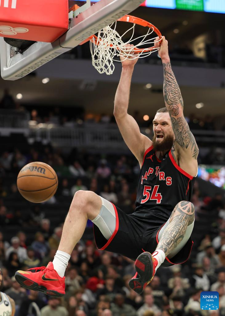 Toronto Raptors’ Sandro Mamukelashvili dunks during the 2025-2026 NBA regular season game between Milwaukee Bucks and Toronto Raptors in Milwaukee, the United States, on Dec. 18, 2025. (Photo by Joel Lerner/Xinhua)