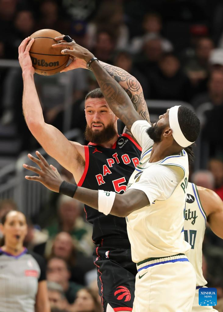 Toronto Raptors’ Sandro Mamukelashvili (L) and Milwaukee Bucks’ Bobby Portis battle for a rebound during the 2025-2026 NBA regular season game between Milwaukee Bucks and Toronto Raptors in Milwaukee, the United States, on Dec. 18, 2025. (Photo by Joel Lerner/Xinhua)