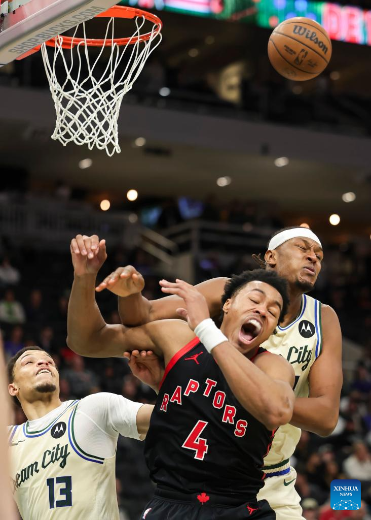 Toronto Raptors’ Jamal Shead (C) grabs a rebound against Milwaukee Bucks’ Jericho Sims (L) and Kevin Porter Jr. (R, front) during the 2025-2026 NBA regular season game between Milwaukee Bucks and Toronto Raptors in Milwaukee, the United States, on Dec. 18, 2025. (Photo by Joel Lerner/Xinhua)