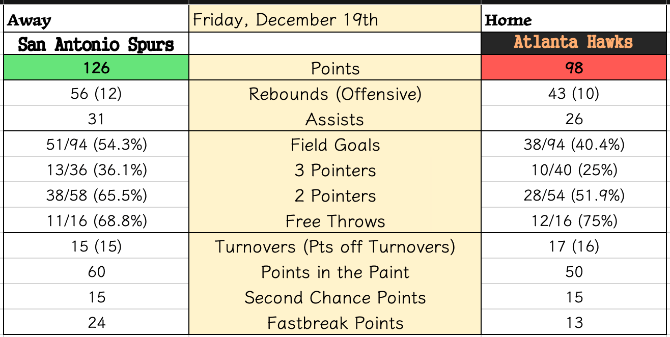 San Antonio scored 60 points in the paint – tied for the sixth-most paint-points allowed by Atlanta this season – while Atlanta managed just 50 on the night. The Hawks shot just 16-for-30 (53.3%) in the restricted area (well below their average on the season) and were also outscored from the perimeter, shooting just 10-for-40 (25%) from three while the Spurs shot 13-for-36 (36.1%).