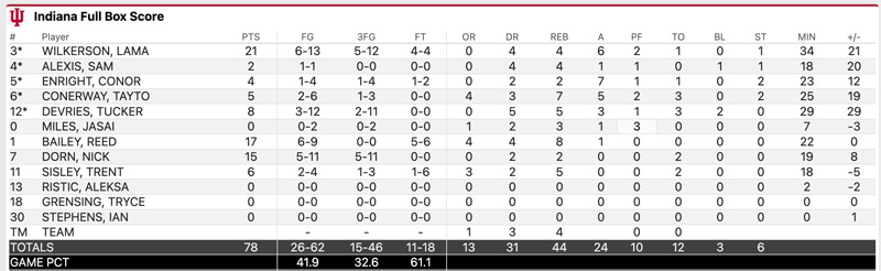 Wilkerson led Indiana with 21 points, including a 5-for-12 mark on 3-p0inters. He added six assists, four rebounds and a steal in 34 minutes. Reed Bailey added 17 points and eight rebounds off the bench in 22 minutes.