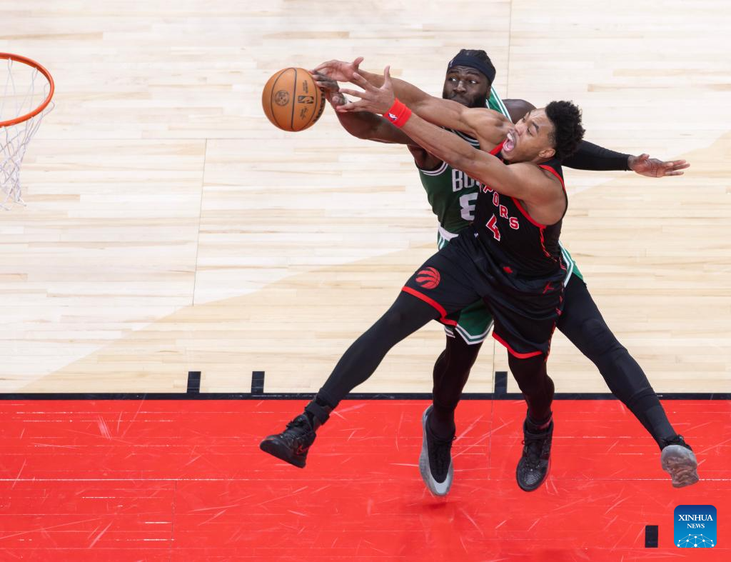 Scottie Barnes (front) of Toronto Raptors fights for a rebound with Neemias Queta of Boston Celtics during the 2025-2026 NBA regular season game between Toronto Raptors and Boston Celtics in Toronto, Canada, on Dec. 20, 2025. (Xinhua/Zou Zheng)