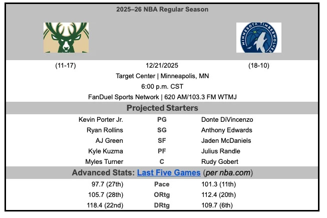 The Milwaukee Bucks (11-17) open a five-game road trip against the Minnesota Timberwolves (18-10) tonight, a stretch that could very well make or break their season. After a shellacking by the Brooklyn Nets, the Bucks were better against the Toronto Raptors but still unable to get over the hump, falling 111-105. They’ll need every bit of an early Christmas miracle tonight, facing a Timberwolves team that just beat the Oklahoma City Thunder 112-107. History is in their favour, though, with the Bucks winners of five of their last six matchups (and 11 of their last 14!).