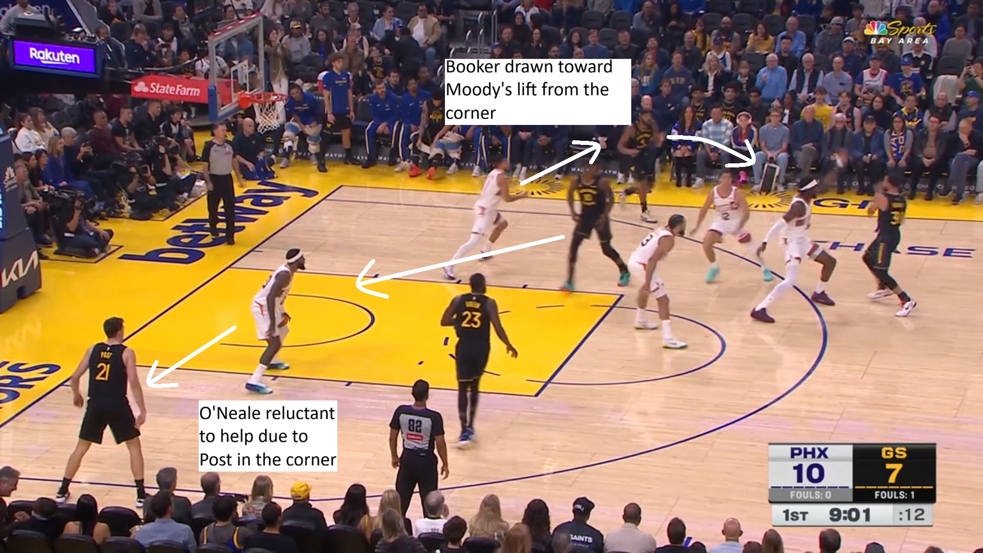 (Note the spacing: Devin Booker as the low man not even thinking about leaving Quinten Post alone in the corner. Dillon Brooks tries to slide into the paint, off of Draymond Green on the wing, but the distance is long and even he hesitates before settling for a slight stunt. As a result, Williams is left all alone on the Butler drive.)