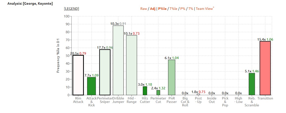 Don’t let these numbers scare you, all you have to do is look at the colors and see them slowly start to improve as the years go on, because that just seems to be the trend with Key. Key has been cutting down his bad playmaking turnovers, which is a catalyst in his slight improvement in his advanced passing numbers — most of his turnovers actually come from scoring the basketball, which makes sense as a young point guard who is your primary ball handler.
