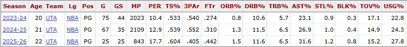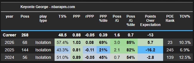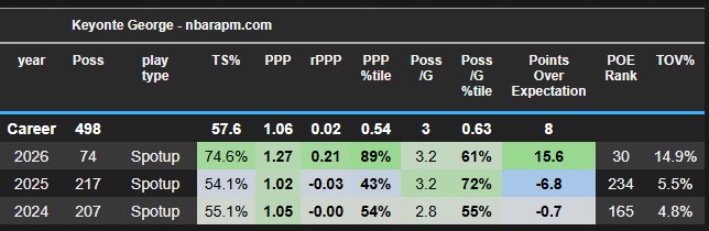 Keyonte has always been an average spot-up shooter dating back to college, and it’s carried over to being about league average, but guess what, HE’S JUMPED IN THAT AREA AS WELL! From having a spot-up TS% average of around 54.6% the previous 2 years, he is already on a tear, jumping 20% in spot-up efficiency, and is in the 89th percentile (ranked 30th in the league).