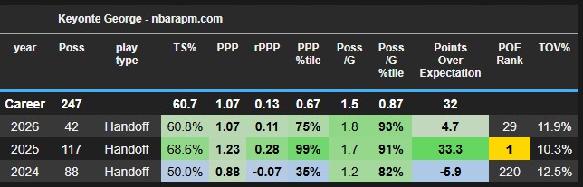 Keyonte George was one of the most effective guards in the league operating out of dribble handoffs last season, finishing ranked No. 1 in handoff efficiency. He showed a clear comfort level coming off DHOs — usually initiated by a big — where his ability to make quick, decisive reads stood out. Whether it was flowing directly into a pull-up jumper, turning the corner when defenders trailed, or hitting the short roll when help stepped up, Keyonte consistently punished defensive mistakes, turning a structure-heavy action into real offensive value rather than simply benefiting from it.