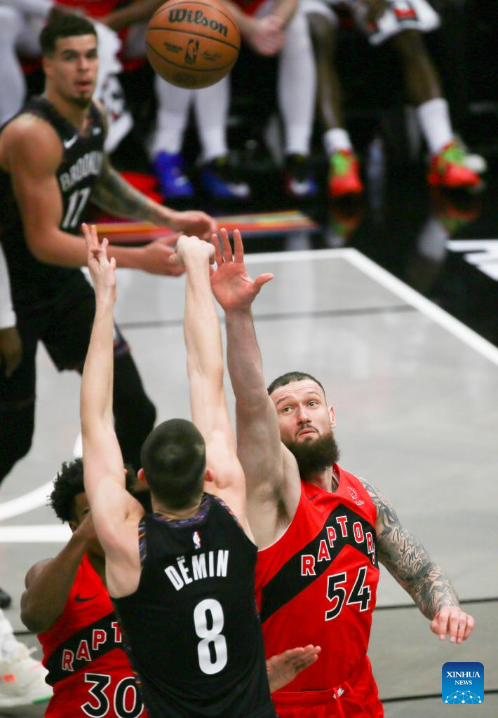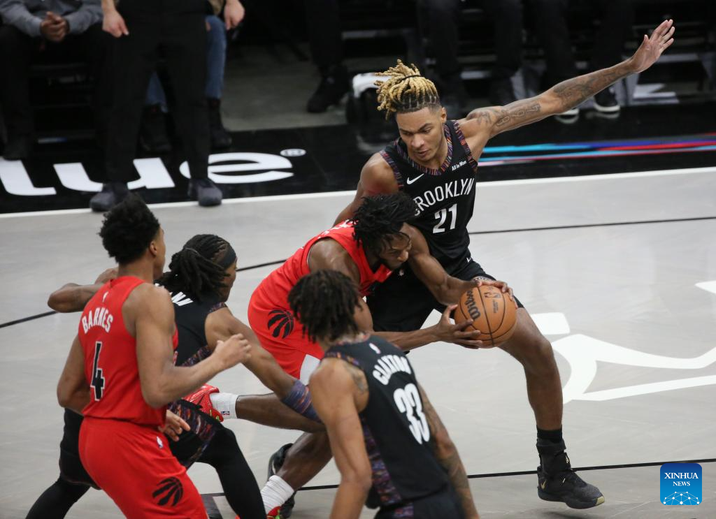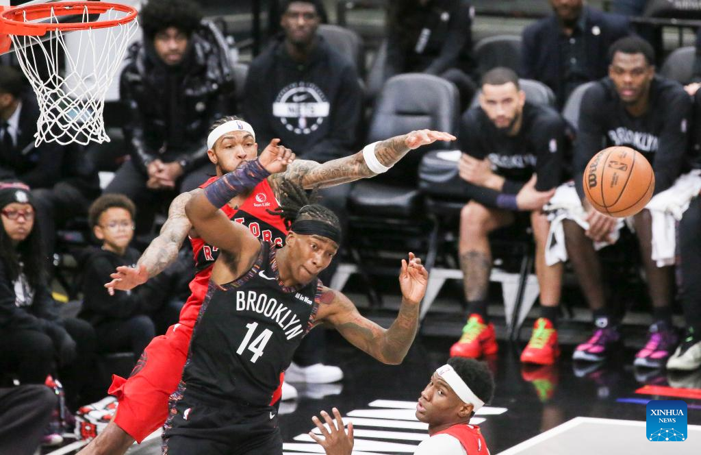Collin Murray-Boyles (R) of Toronto Raptors competes during the 2025-2026 NBA regular season game between Brooklyn Nets and Toronto Raptors in New York, the United States, Dec. 21, 2025. (Xinhua/Zhang Fengguo)