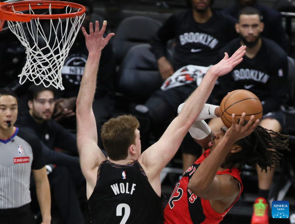 Noah Clowney (1st R) of Brooklyn Nets defends during the 2025-2026 NBA regular season game between Brooklyn Nets and Toronto Raptors in New York, the United States, Dec. 21, 2025. (Xinhua/Zhang Fengguo)