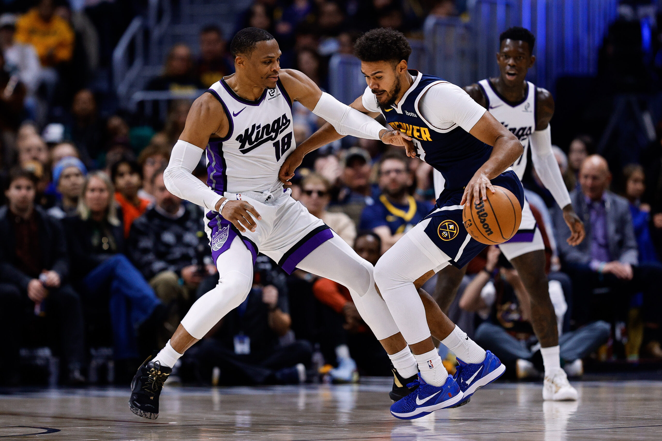 Denver Nuggets forward Cam Johnson controls the ball as Sacramento Kings guard Russell Westbrook guards. Mandatory Credit: Isaiah J. Downing-Imagn Images