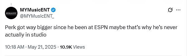 ‘Perk got way bigger since he been at ESPN maybe that’s why he’s never actually in studio,’ a fourth added.Â