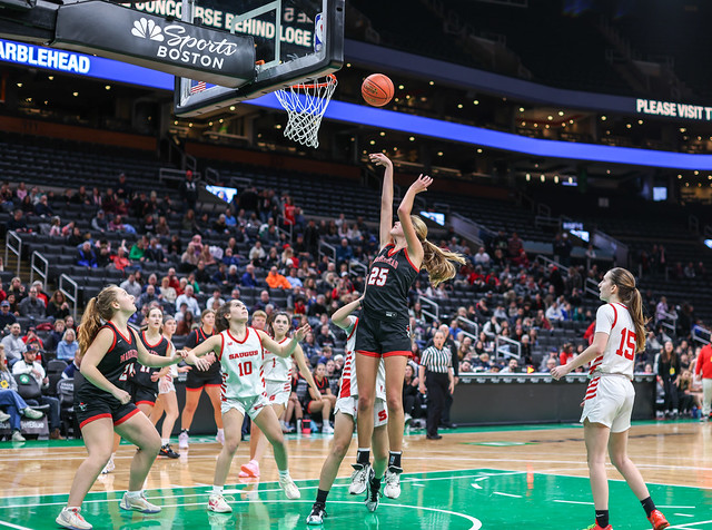 Marblehead High girls basketball senior captain Greta Sachs (25) scores two on a layup against Saugus at the TD Garden last January. Tessa Andriano and Samara Dosch join Sachs as captains of this year’s team. COURTESY PHOTO / VICTORIA DOSCH