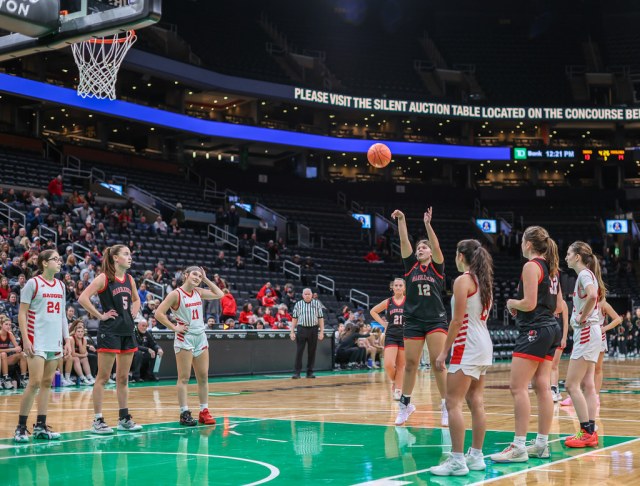Marblehead High girls basketball senior captain Tessa Andriano (12) shoots a free throw against Saugus at the TD Garden last January. Greta Sachs and Samara Dosch join Andriano as captains of this year’s team.  COURTESY PHOTO / VICTORIA DOSCH