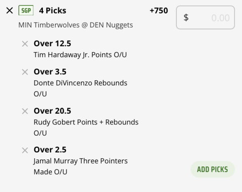 If you’re looking to use these props to create a Same Game Parlay (SPG) or an SPGx, one other leg you can add to the mix is the over on Murray’s 3PM. The four legs listed here combine to be a +750 SGP as you can see below.