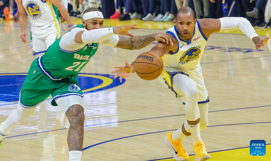 Stephen Curry (R) of Golden State Warriors breaks through during the 2025-2026 NBA regular season game between Golden State Warriors and Dallas Mavericks in San Francisco, the United States, Dec. 25, 2025. (Photo by Arthur Dong/Xinhua)