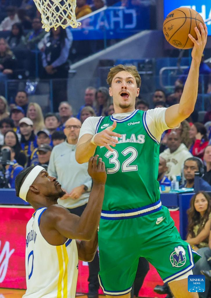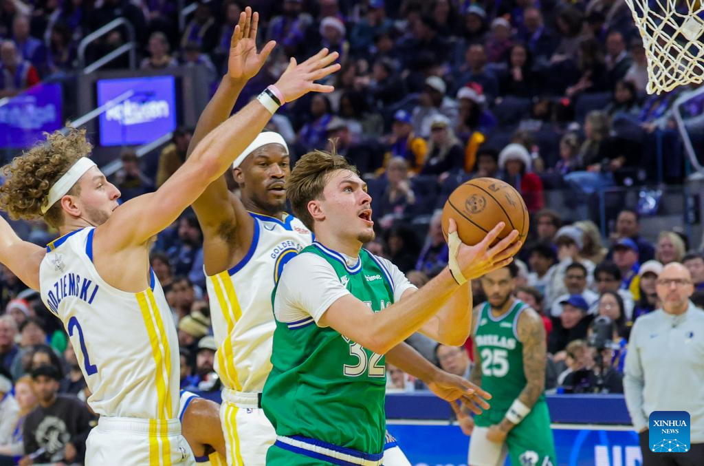 Cooper Flagg (R) of Dallas Mavericks goes for a lay-up during the 2025-2026 NBA regular season game between Golden State Warriors and Dallas Mavericks in San Francisco, the United States, Dec. 25, 2025. (Photo by Arthur Dong/Xinhua)