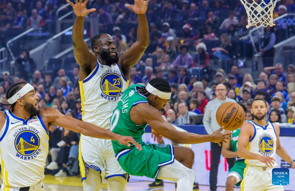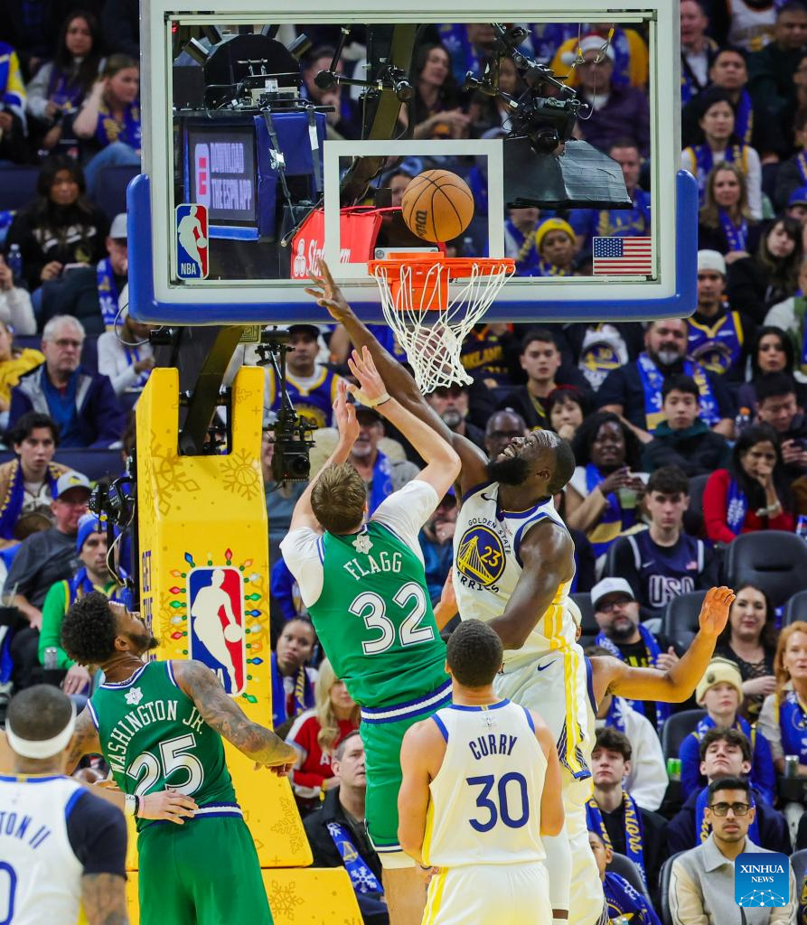 Draymond Green (top R) of Golden State Warriors defends Cooper Flagg (top L) of Dallas Mavericks during the 2025-2026 NBA regular season game between Golden State Warriors and Dallas Mavericks in San Francisco, the United States, Dec. 25, 2025. (Photo by Arthur Dong/Xinhua)