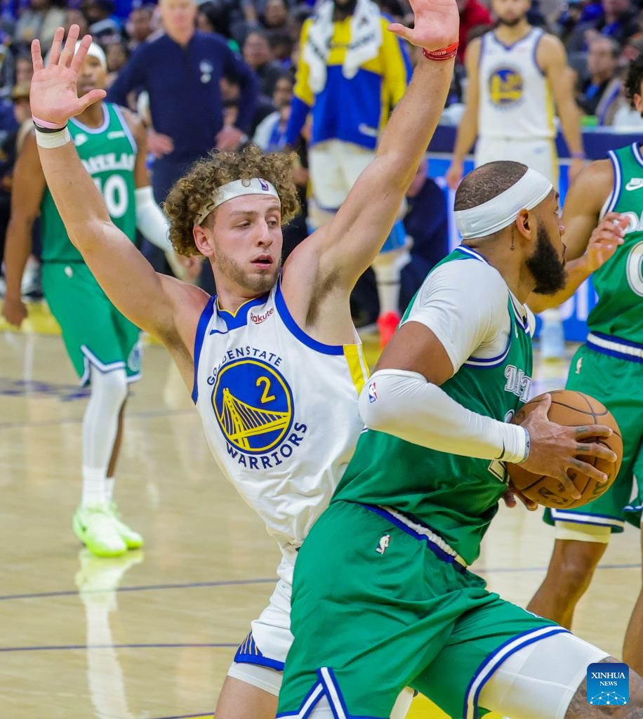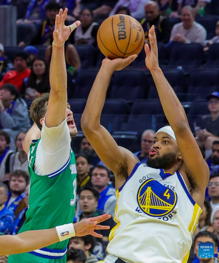 Moses Moody (R) of Golden State Warriors shoots during the 2025-2026 NBA regular season game between Golden State Warriors and Dallas Mavericks in San Francisco, the United States, Dec. 25, 2025. (Photo by Arthur Dong/Xinhua)