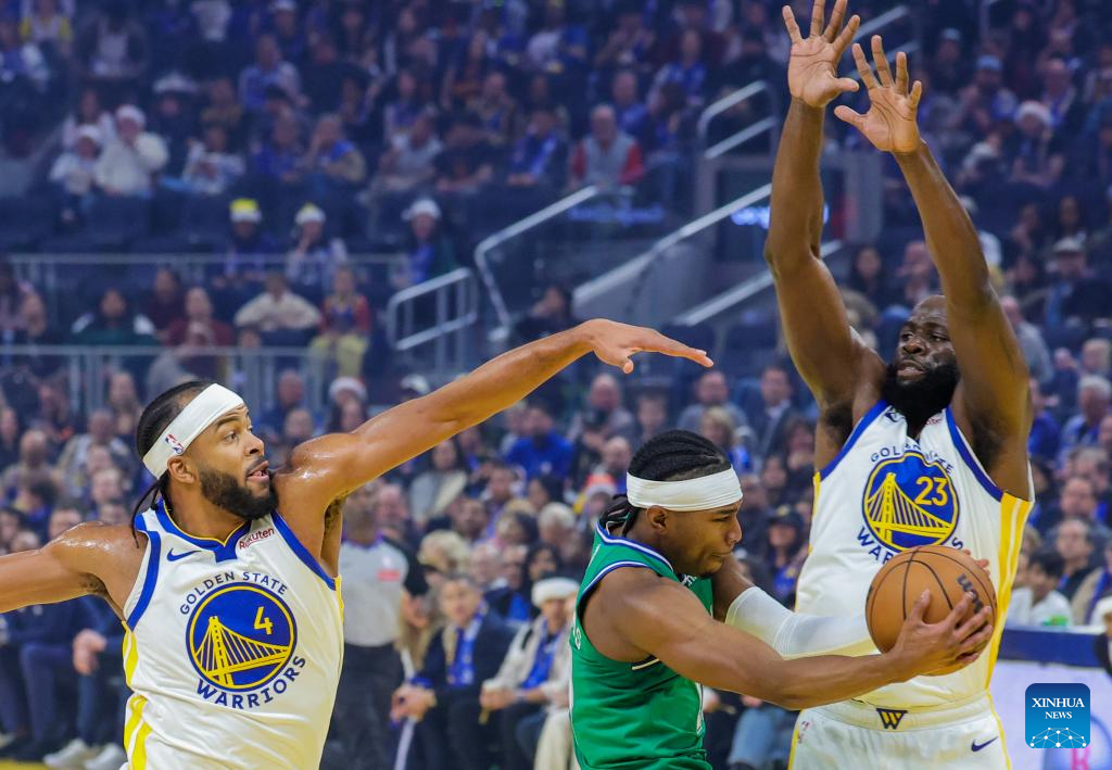 Draymond Green (R) and Moses Moody (L) of Golden State Warriors defend Brandon Williams of Dallas Mavericks during the 2025-2026 NBA regular season game between Golden State Warriors and Dallas Mavericks in San Francisco, the United States, Dec. 25, 2025. (Photo by Arthur Dong/Xinhua)