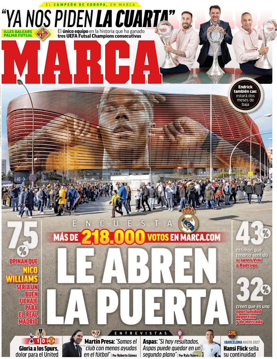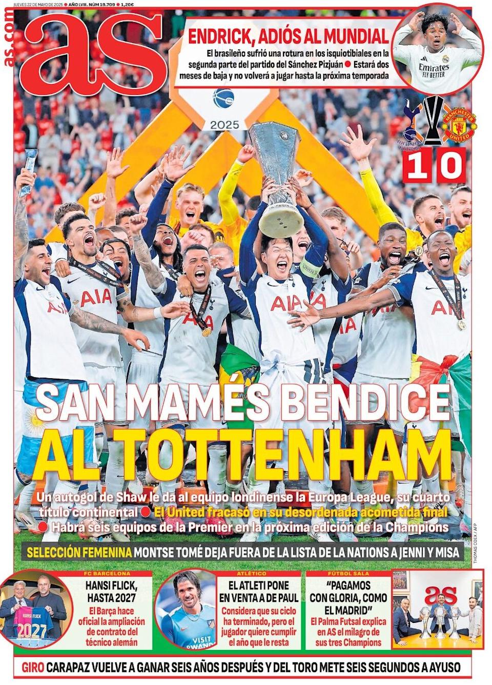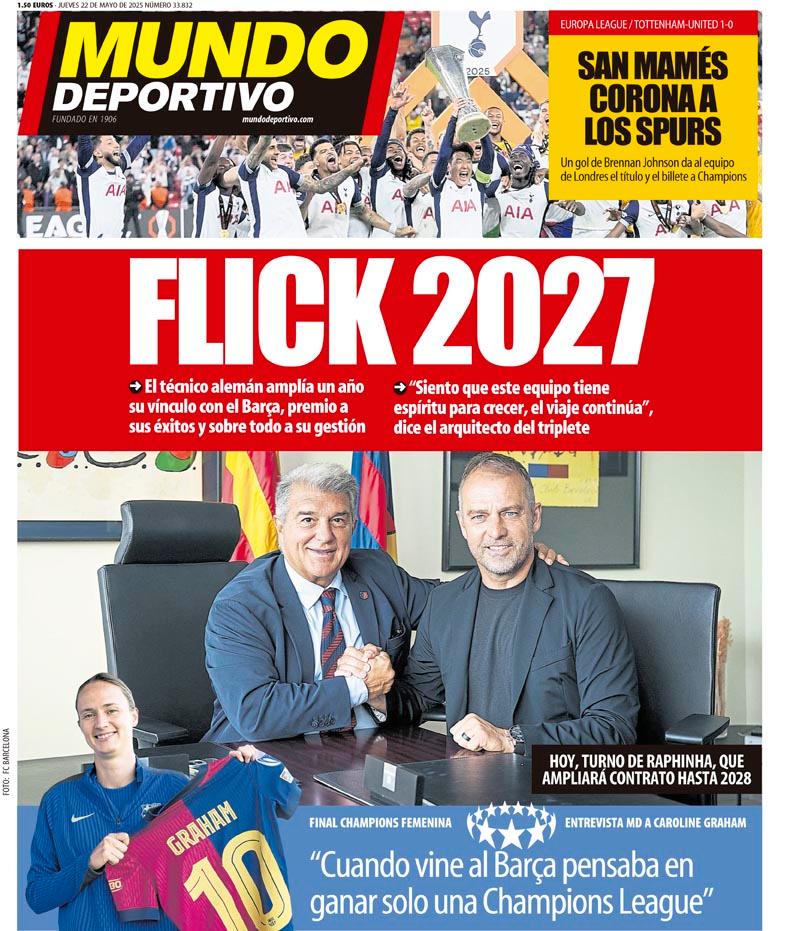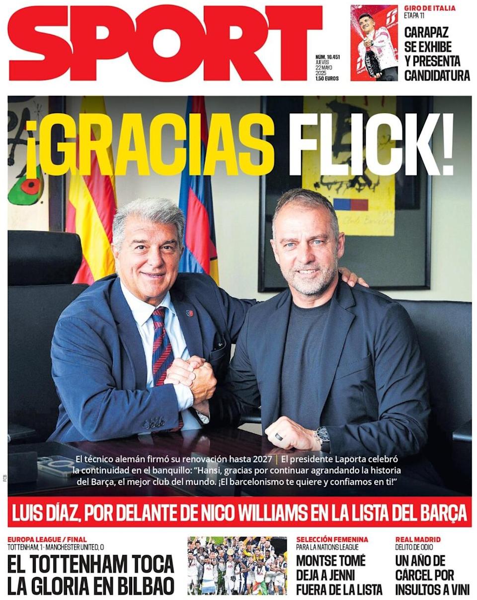 The front page of Thursday, May 22, features the renewal of Hansi Flick, Tottenham as the Europa League champion, and the possibility of Nico Williams signing with Real Madrid.