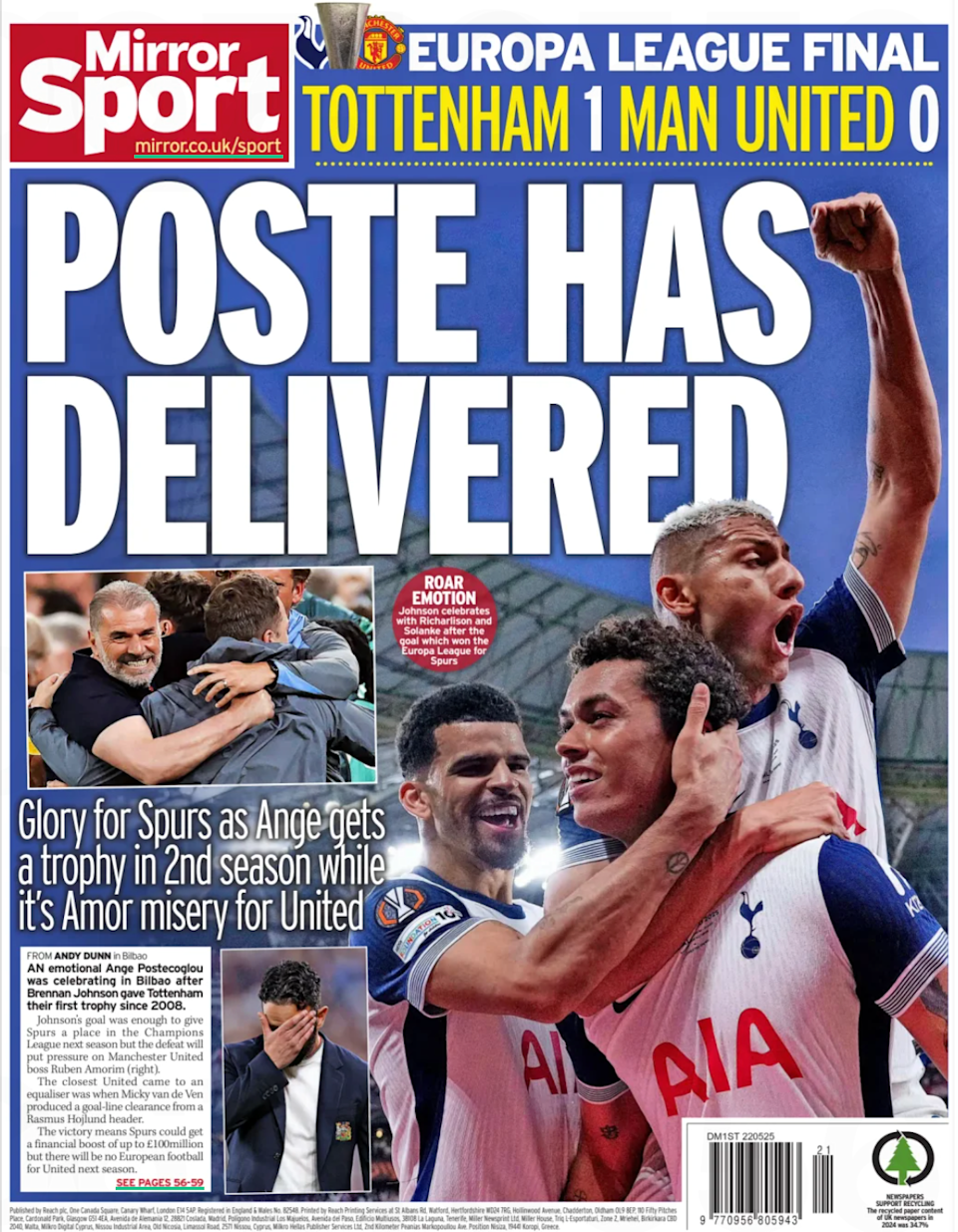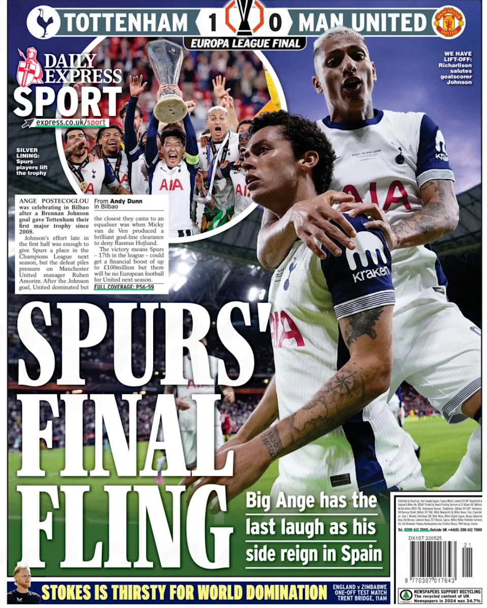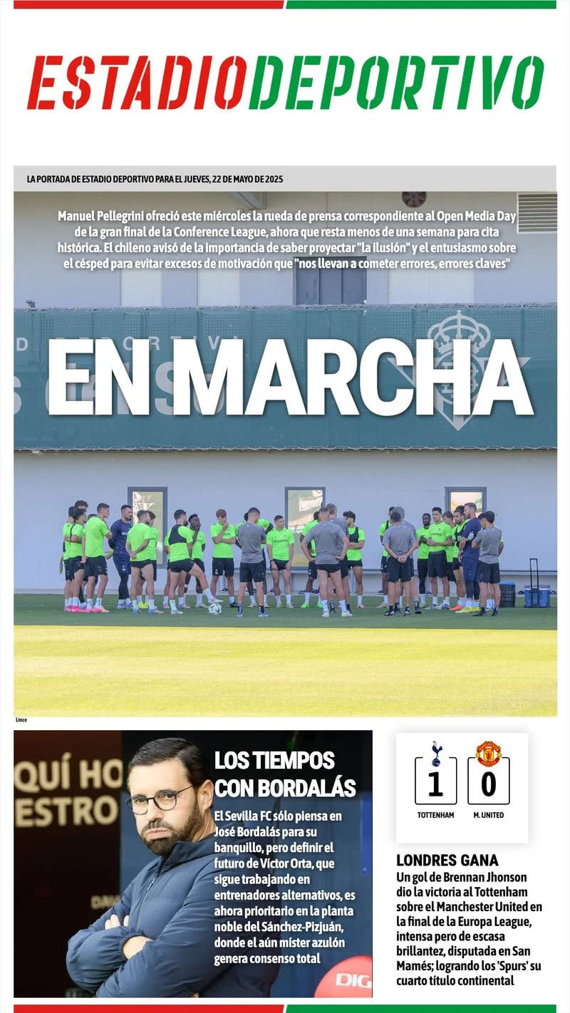 The front page of Thursday, May 22, features the renewal of Hansi Flick, Tottenham as the Europa League champion, and the possibility of Nico Williams signing with Real Madrid.