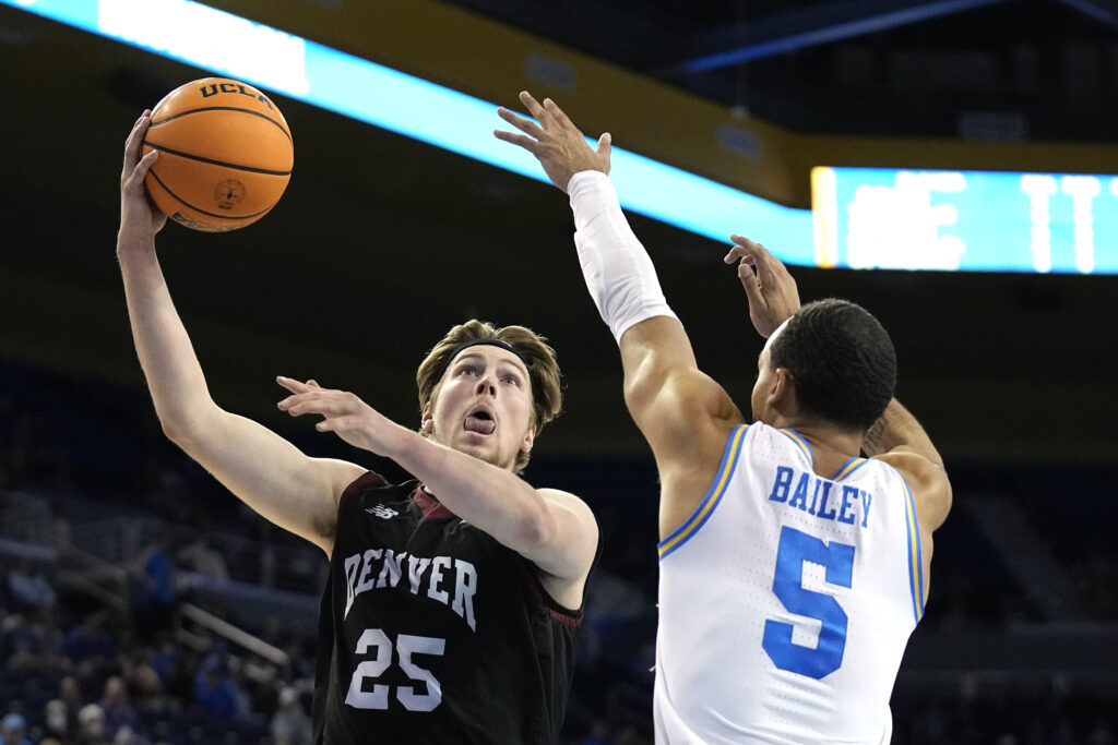 Denver forward Touko Tainamo, left, shoots as UCLA guard Amari Bailey defends during the first half of an NCAA college basketball game Saturday, Dec. 10, 2022, in Los Angeles. (AP File Photo/Mark J. Terrill)